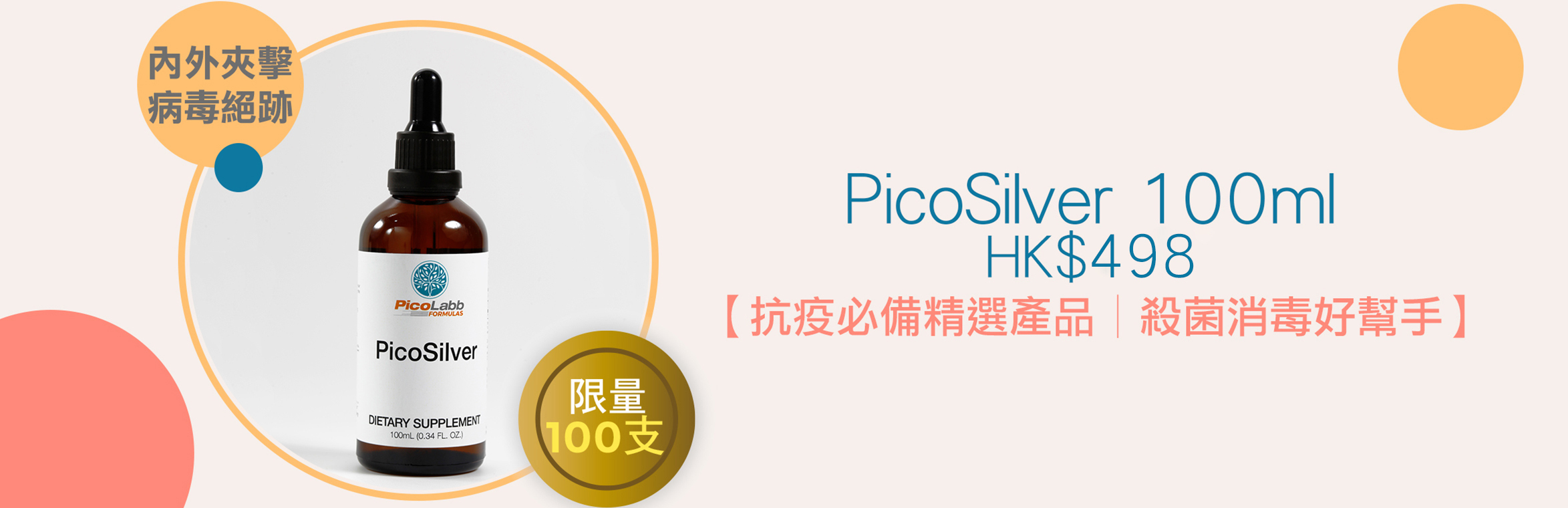 PicoSilver 純銀微粒懸浮液,高效殺滅多種細菌病毒,純天然,無色,無味,可在外部或內部使用。香港檢測及鑑定中心的第三方獨立驗證。