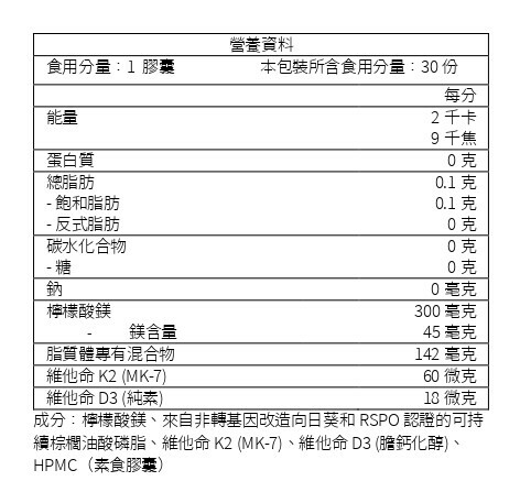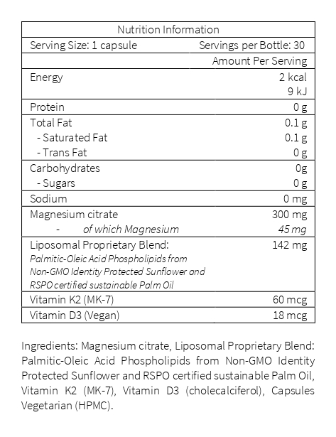 成分: 檸檬酸鎂、脂質體專有混合物:來自非轉基因改造向日葵的棕櫚油酸磷脂、維他命K2 (MK-7)、維他命D3 (膽鈣化醇)、HPMC(素食膠囊)